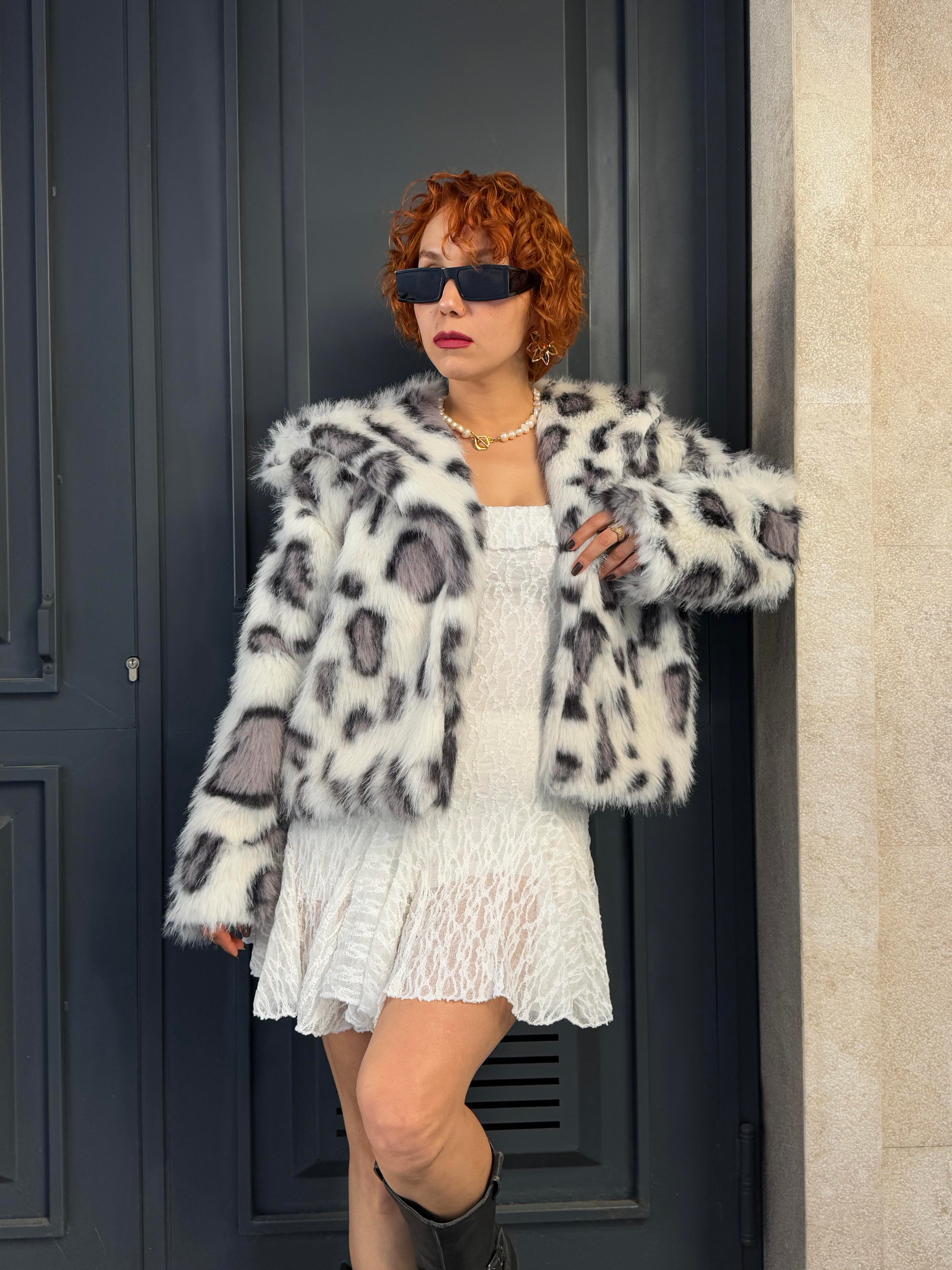 Pigment ve su bazlı baskı teknikleri ile üretilen hayvan desenli suni kürk mont, şık ve modern bir görünüm sunar.
